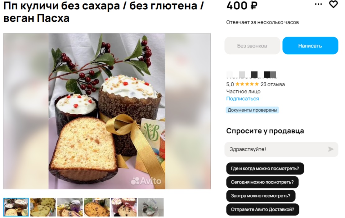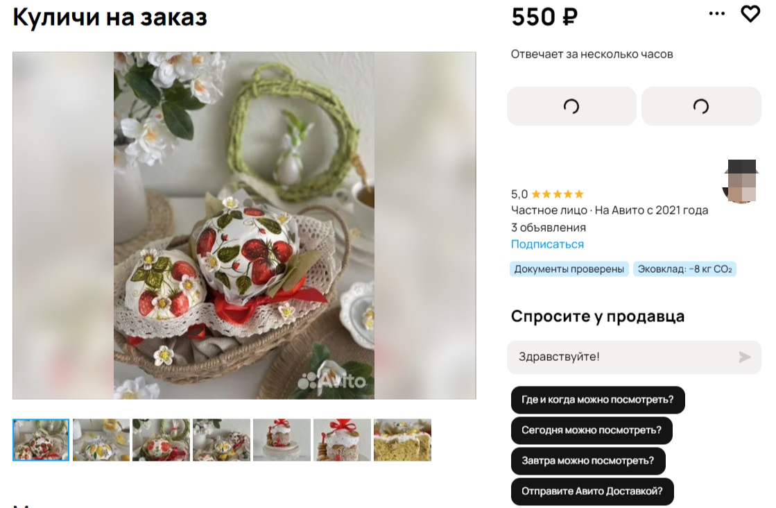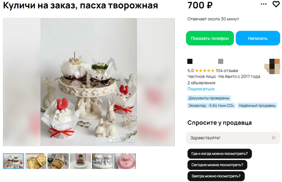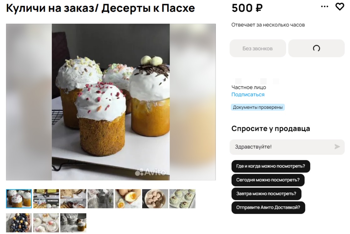 Для тех, кто ищет что-то более изысканное, есть немало предложений на сайтах объявлений. Однако цены на авторские пасхальные изделия кусаются. Многие продавцы, очевидно, делают ставку на праздничный ажиотаж, устанавливая ценники, которые сложно назвать доступными. Стоимость творожных и сдобных куличей, а также традиционных пасх стартует от 400 рублей и доходит до 1500 рублей.