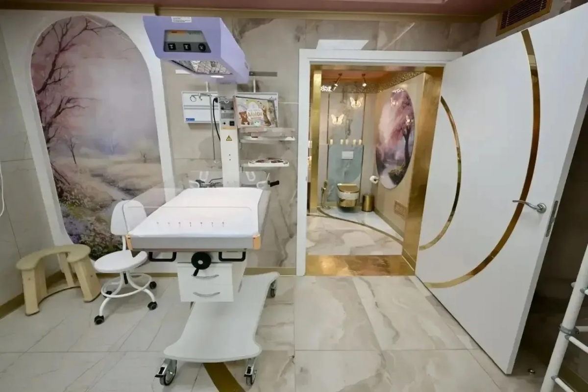 Первую такую родовую палату открыли в перинатальном центре Первоуральска. Кстати, между потугами роженица может полазить на шведской стенке, видимо, это должно облегчить как-то процесс.
