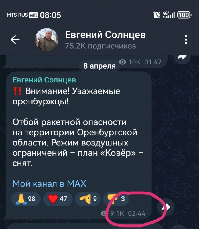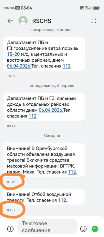 Ночью 8 апреля 2026 года на территории Оренбургской области была объявлена воздушная опасность. Заявка на информирование населения SMS-рассылкой своевременно была направлена операторам мобильной связи МегаФон, МТС, Билайн, PROmobile и Т2.