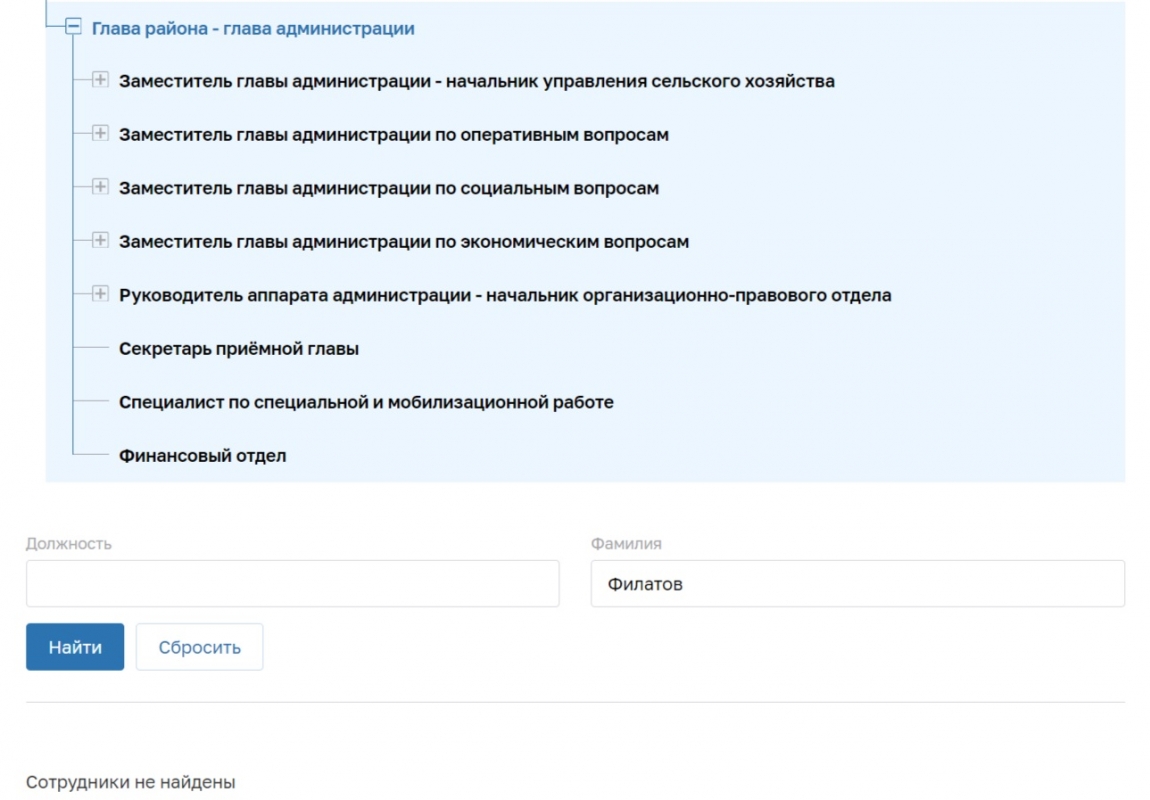 Фото Дениса Филатова до сих пор висит на главной странице сайта администрации района, однако в структуре администрации данных о нём уже нет.