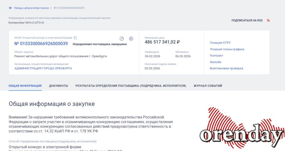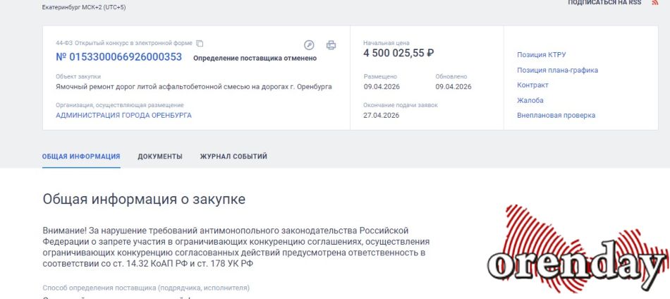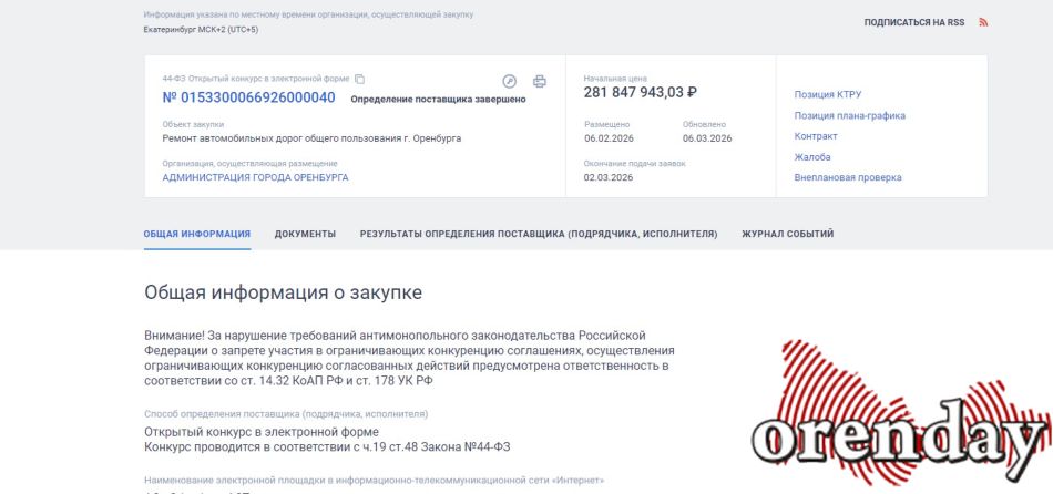 Кроме этого, администрация Оренбурга ищет подрядчика для проведения ямочного ремонта дорог общего пользования. Начальная цена контракта - 4,5 миллиона рублей. От подрядчика требуется выполнение работ до конца текущего года.