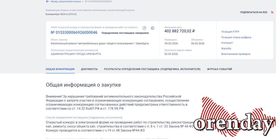 Ремонт автомобильной дороги общего пользования к поселку Пруды Оренбурга. Работы должны быть выполнены до 1 февраля 2027 года.