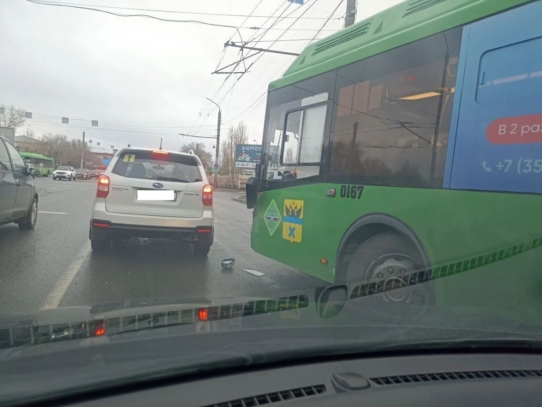 Дорогу не поделили автобус и легковой автомобиль Subaru. Внедорожник и общественный транспорт притерлись зеркалами у перекрестка с улицей Орской.