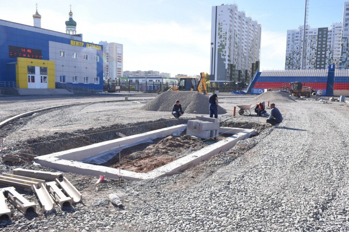 За два месяца здесь демонтировали изношенное покрытие, подготовили основание нового футбольного поля, установили бортовой камень, дренажный лоток, предназначенный для сбора и водоотведения дождевых вод. Подготовили основание под беговые дорожки.