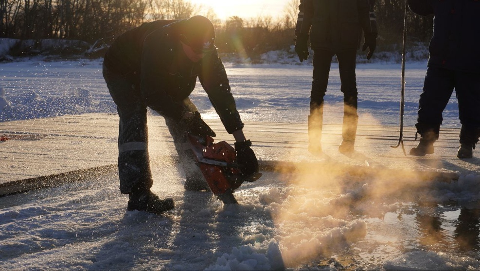 Сотрудники подрядной организации в районе автомобильного моста на реке Урал приступили к подготовке купели, чтобы православные оренбуржцы смогли совершить обряд омовения на Крещение Господе.