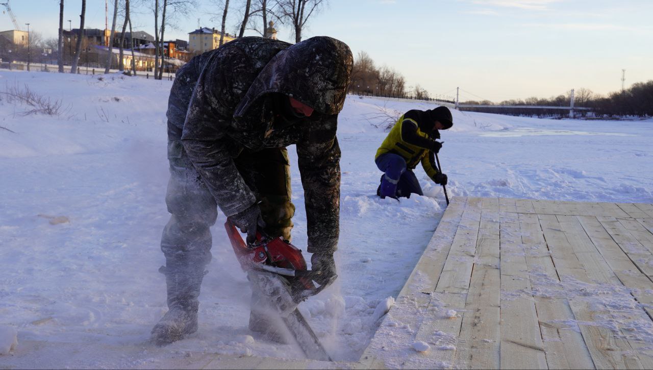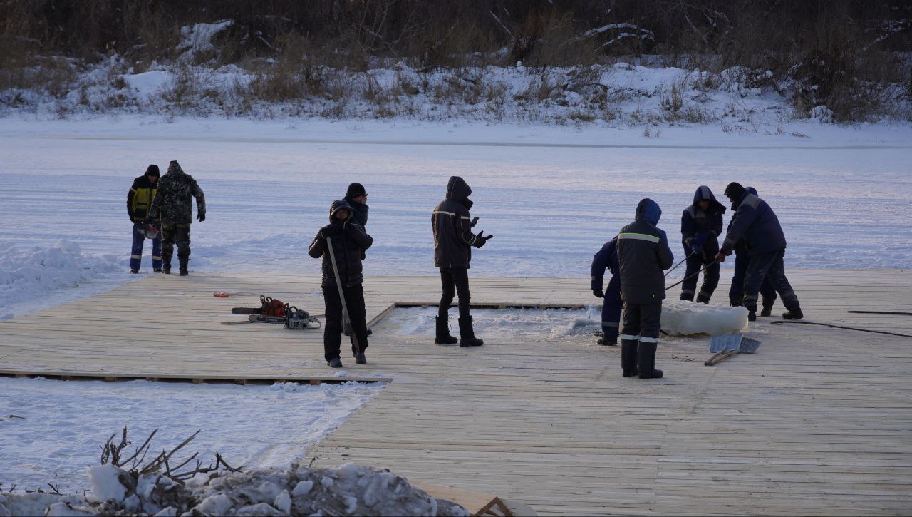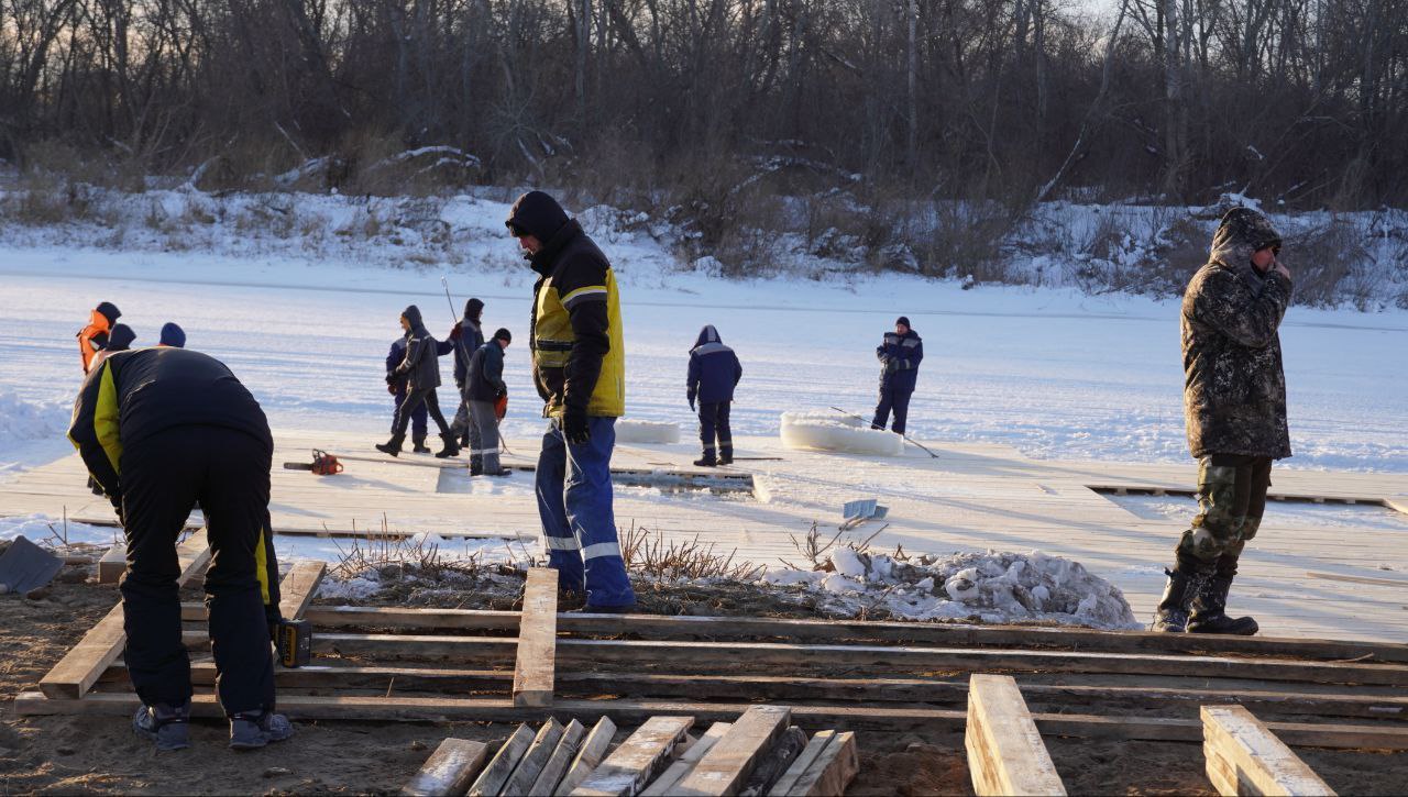 В ближайшие дни установят подледное ограждение, фан‑барьеры, которые отделят проход от набережной к купели, соберут ступени и перила для безопасного спуска людей от палаток к воде.