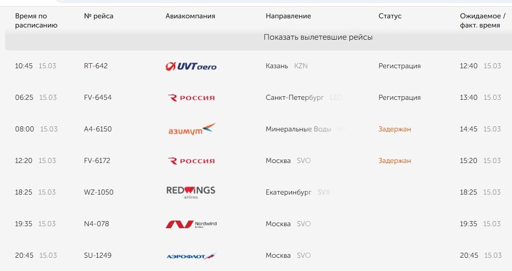 Так, по данным онлайн‑табло аэропорта, рейс FV-6454 в Санкт-Петербург, изначально запланированный на 06:25, теперь отправится в 13:40, задерживаясь на 7 часов 15 минут. Рейс FV-6172 в Москву, который должен был вылететь в 12:20, перенесен на 15:20, что составляет 3 часа задержки. Также рейс A4-6150 авиакомпании «Азимут» в Минеральные Воды, с первоначальным временем вылета 08:00, теперь ожидается в 14:45, задерживаясь на 6 часов 45 минут.