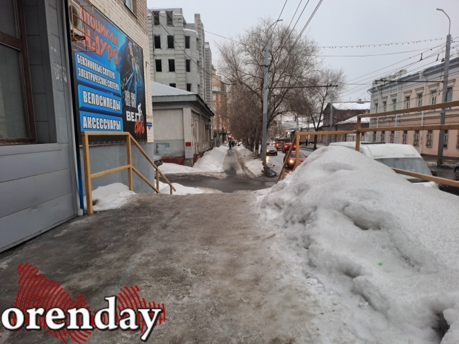 Небольшой участок для прохода пешеходов находится вдоль дома №57А. Подняться туда можно по лестнице, которая, как и весь дальнейший путь, полностью покрыта льдом.