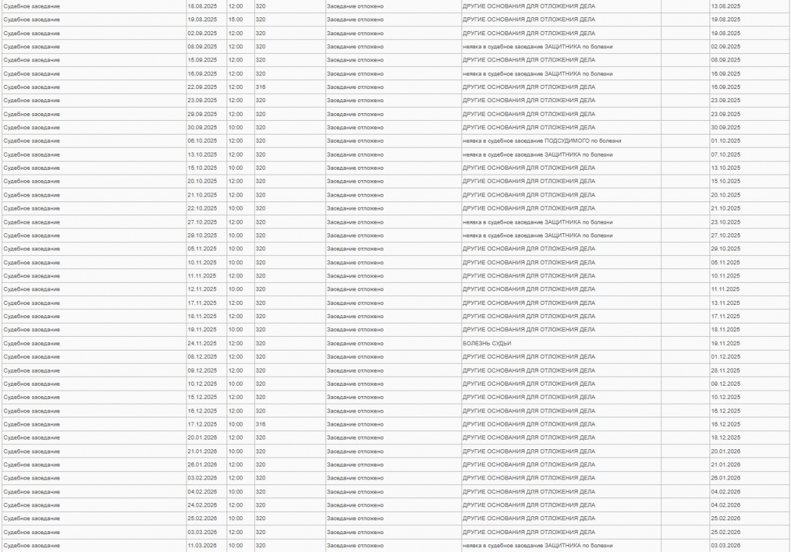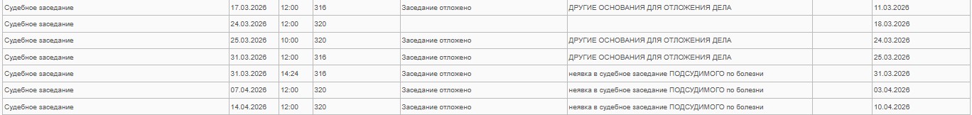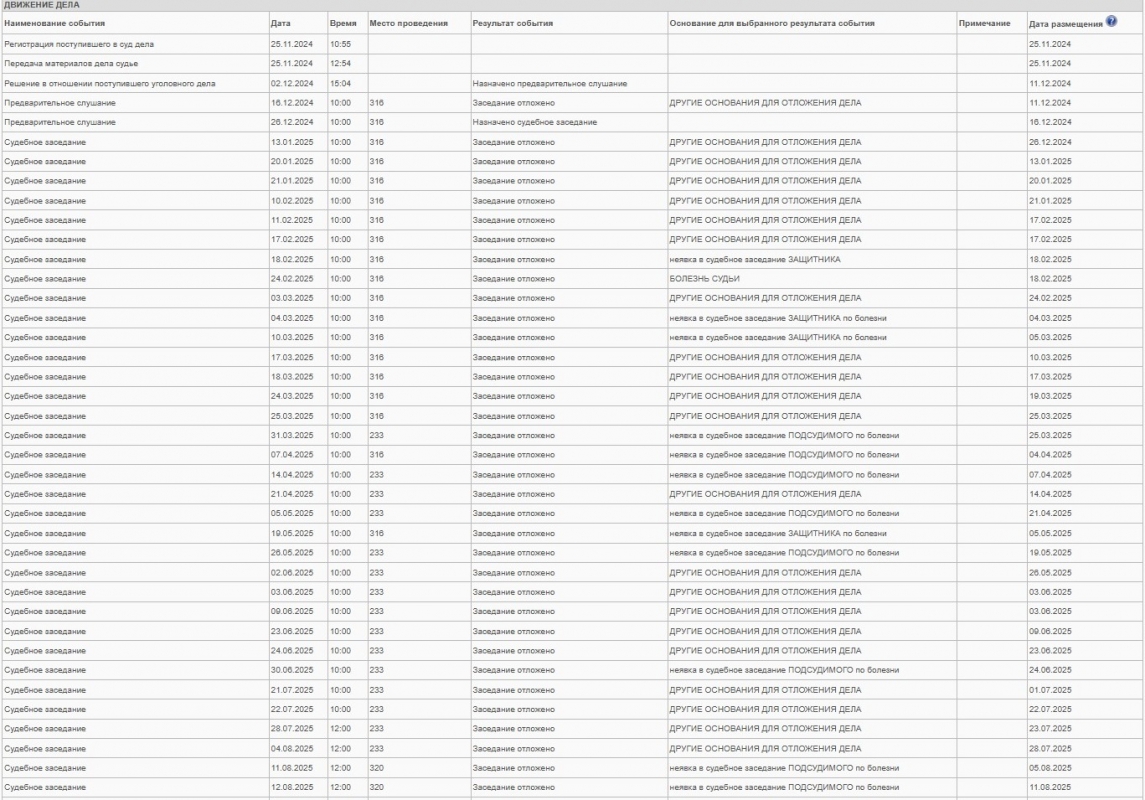Начиная с 15 февраля 2015 года, заседания суда по болезни участников процесса, а их всего было назначено 84, отложено 23 раза! Дважды занемог судья, девять раз подвело здоровье защитников и 12 раз заседание было отложено из-за хвори подсудимых.