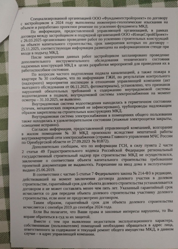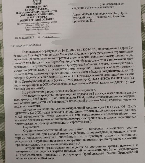 Министерство строительства, ЖКХ, дорожного хозяйства и транспорта Оренбургской области ответило на коллективное обращение жильцов. Ведомство сослалось на заключение специализированой организации, которая оценивает состояние строительных конструкций дома как ограниченно-работоспособное. В ответе говорится, что несущая способность снижена, но опасности внезапного обрушения нет. А застройщик при этом следит за стоянием трещин и ставит специальные маячки. До 25 ноября 2025 года застройщик должен был завершить работы по усилению строительных конструкций. Жильцы же пребывают в неведении на счёт принятых мер - о том, когда и какие работы проводились и проводились ли вообще, их не уведомляли.