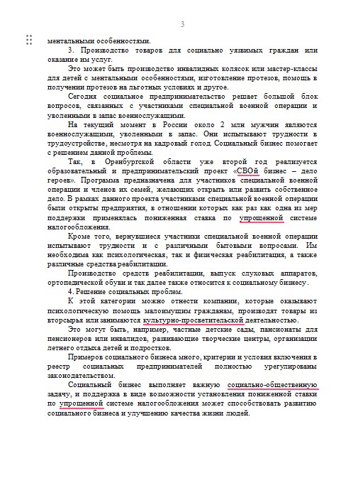 «социальный бизнес — это более 12 тысяч предприятий в реестре СП, более 100 тысяч трудоустроенных и миллионы граждан, которые пользуются товарами и услугами социальных предпринимателей. Мы считаем, что бизнес бизнесу рознь и нельзя сравнивать предприятия со сверх доходами, например такие как банки, которые в прошлом году получили почти 3,7 трл.рублей прибыли, и предприятия, которые получают минимальную прибыль и выполняют социальные задачи. Для такого бизнеса налоговая нагрузка должна быть однозначно снижена».