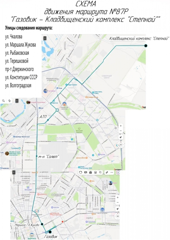 - № 87Р: «Никольский собор - Кладбищенский комплекс». Остановки в прямом направлении: «ДК «Газовик», «ул. Маршала Г.К. Жукова», «м-н Салют», «АТП», «Кладбищенский комплекс». В обратном направлении: «Кладбищенский комплекс», «АТП», «м-н Салют», «ул. Маршала Г.К. Жукова», «ДК «Газовик».