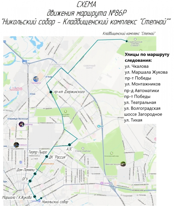 - №86Р: «Никольский собор - Кладбищенский комплекс». Остановки в прямом направлении: «Никольский собор», «ул. Маршала Г.К. Жукова», «ОГУ», «Дом Памяти», «ДК «Россия», «АЗС (ул. Монтажников)», «пр. Дзержинского», «Кладбищенский комплекс». В обратном направлении: «Кладбищенский комплекс», «пр. Дзержинского», «АЗС (ул. Монтажников)», «Театр «Пьеро», «Дом Памяти», «ОГУ», «ул. Маршала Г.К. Жукова», «ДК «Газовик».
