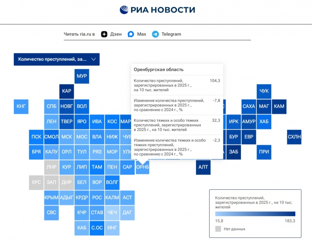 В Оренбуржье показатель равен 104,3. За год он снизился на 7,8 процента. При этом количество зарегистрированных тяжких и особо тяжких преступлений по сравнению с 2024 годом уменьшилось на 2,3 процента и составило 32,3 на 10 тысяч человек.