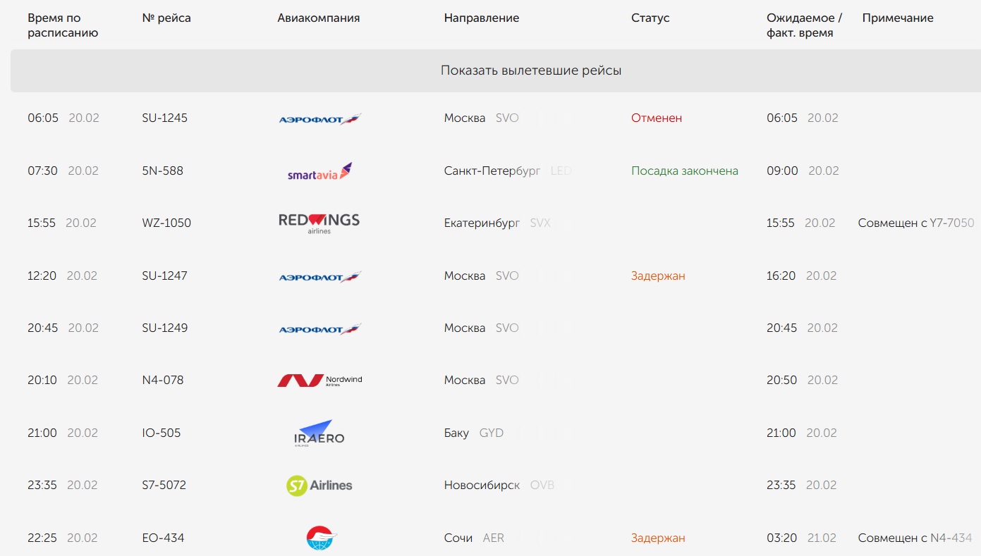 Так, с 12.20 на 16.40 перенесен вылет самолета до Москвы. Пассажиры, купившие билеты на сегодняшний рейс до Сочи в 22.25 также не смогут улетететь вовремя: время вылета сдвинуто на 03.20 21 февраля.