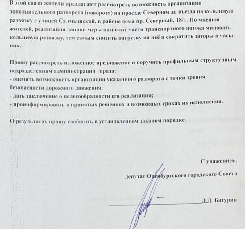 «Жители предложили рассмотреть возможность организации дополнительного разворота на проезде Северном — до въезда на кольцевую развязку, в районе дома пр. Северный, 18/1. По их мнению, это позволит части транспорта миновать кольцо, снизить нагрузку и сократить заторы в часы пик», - сообщил Денис Батурин.