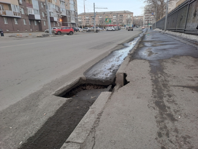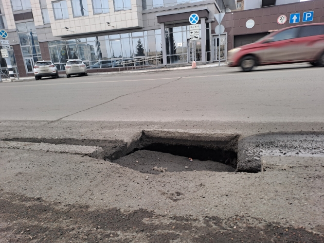 В Оренбурге водители обратили внимание на серьезный дефект дорожного покрытия на улице Краснознаменной. Прямо у края проезжей части, в правой полосе, образовался глубокий провал.