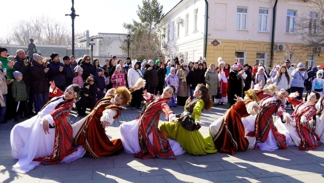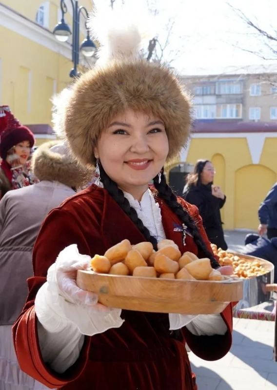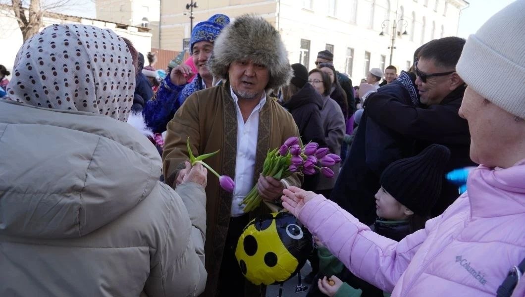 Горожан и гостей угощали традиционными баурсаками, а женщинам дарили цветы.