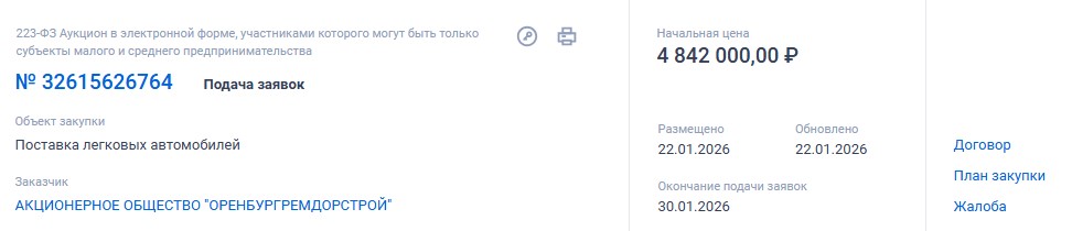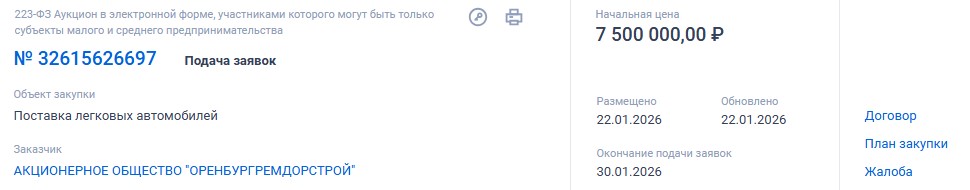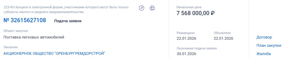 Очень остро нуждается АО «Оренбургремдорстрой» и в черном минивене за 7 568 000 рублей.