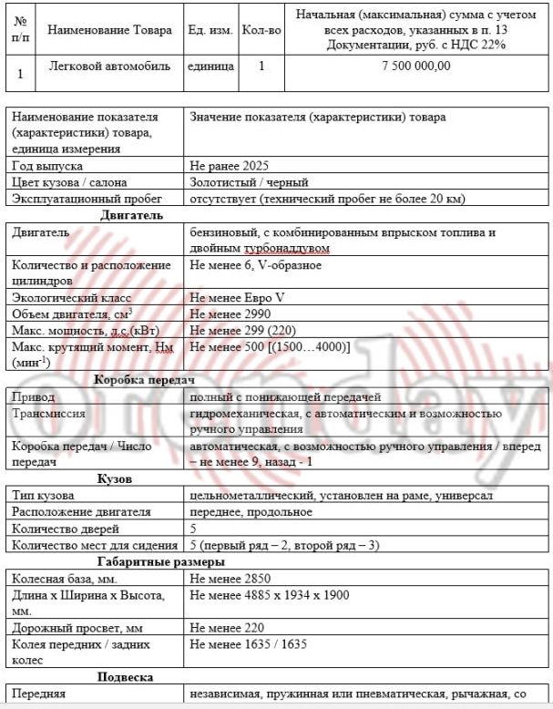 Так, АО на 12 811 800 рублей рассчитывает приобрести шесть полноприводных автомобилей по 2 135 300 рублей с мощностью двигателя не менее 149 лошадок в белом или сером цвете не ранее 2025 года выпуска.
