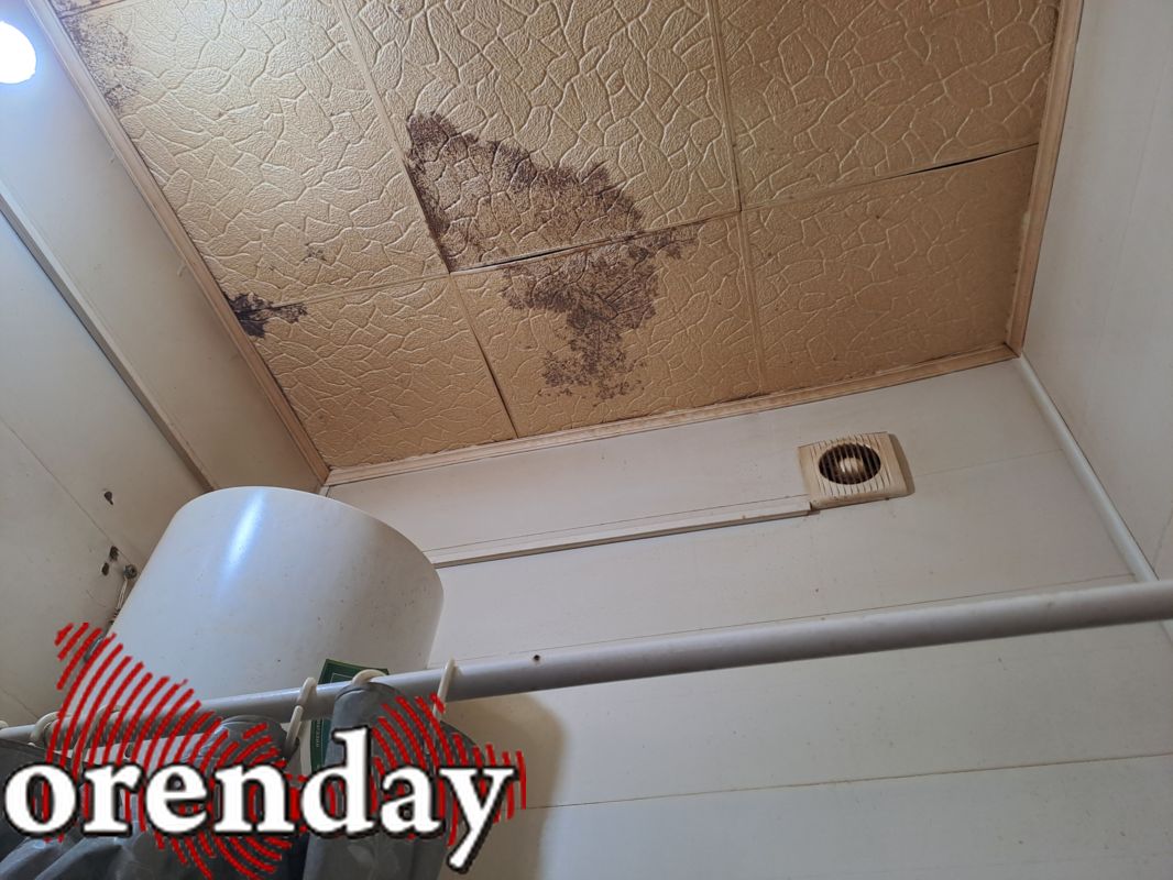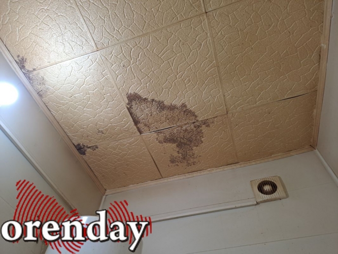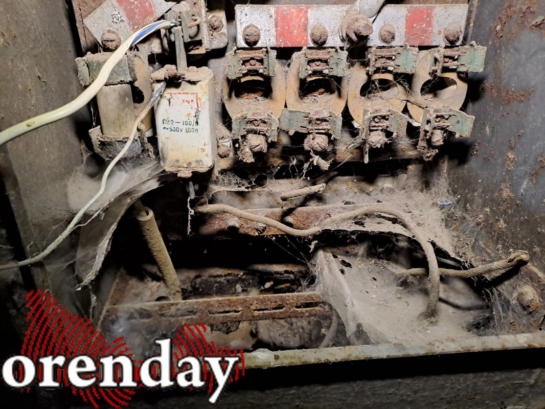 Рядом с электрическим щитком, на который течет вода, толстая труба отопления, подпёртая обычной доской, так как крепления давным-давно сгнили.