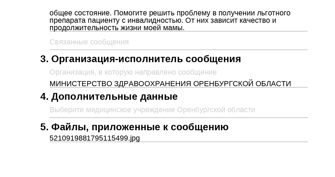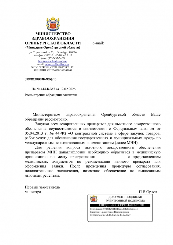 Р.S Пациентка планирует записаться на личный прием министра здравоохранения Оренбургской области Андрея Шатилова. Если не удалось получить обратную связь от заместителя министра, то, возможно, получится поговорить с министром по данной проблеме.