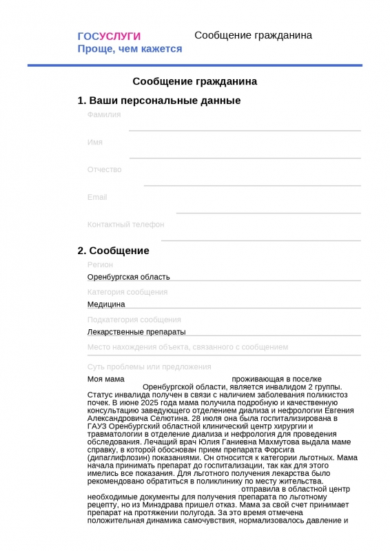 «Лекарство стоит почти 3 000 рублей за упаковку. Я живу в селе, пенсионерка. Мое заболевание рано или поздно приведет к проведению гемодиализа и сейчас главная задача – оттянуть этот момент. Я оценила положительный эффект от приема препарата, покупая его самостоятельно в надежде, что скоро смогу получать его в льготном порядке. После отказа врачи мне посочувствовали, но ничем помочь не могут. Через Госуслуги обратились в минздрав региона с просьбой разобраться в ситуации, ознакомиться с документами. Система приняла заявление, и вскоре пришел ответ, поразивший меня до глубины души. Несмотря на то, что в жалобе мы четко указали, что обращение в поликлинику не принесло результатов, так как заявка на получение льготного лекарства отклонена региональным министерством здравоохранения, первый заместитель министра здравоохранения Оренбургской области Павел Орлов вникать в проблему не стал - направил меня разбираться в поликлинику по месту жительства. Как объяснить человеку, что этот этап пройден несколько раз, и раз есть жалоба, значит, нужно разобраться и хотя бы ознакомиться с документами, пообщаться с лечащим врачом», - рассказала оренбурженка.