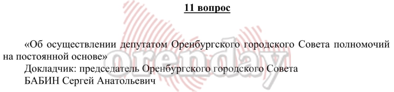 На постоянной основе могут работать не более 10 процентов депутатов от установленной численности представительного органа муниципального образования. Применительно к Оренбургскому городскому Совету - это четыре депутата… В настоящее время в пределах допустимой квоты в Оренбургском городском Совете свои полномочия на постоянной основе осуществляют три депутата (Березнева О.П., Ковалёв С.С.), в том числе председатель Оренбургского городского Совета (Бабин С.А.). Вопрос об определении еще одного депутата, осуществляющего свои полномочия на постоянной основе, Оренбургским городским Советом не рассматривался. При этом считаю, что на сегодняшний день достаточно трех депутатов, осуществляющих свои полномочия на постоянной основе, - в декабре 2025 года заявлял Орендэй председатель горсовета Сергей Бабин.
