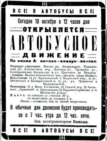 Торжественный запуск состоялся в полдень 10 октября 1925 года. Автобусы с первыми пассажирами отправились по двум маршрутам: «Железнодорожный вокзал - Виадук» и «Форштадт - Советская - Новостройка».