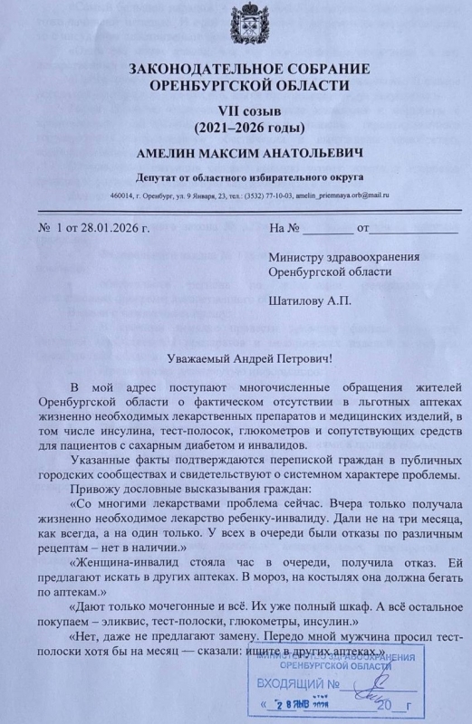 Максим Амелин, депутат Законодательского Собрания Оренбургской области, и Денис Батурин, депутат Оренбургского городского Совета, попросили объяснить Андрея Шатилова, министра регионального здравоохранения, что в областном центре происходит с жизненно необходимыми лекарственными препаратами. Люди не могут получить льготные лекарства.