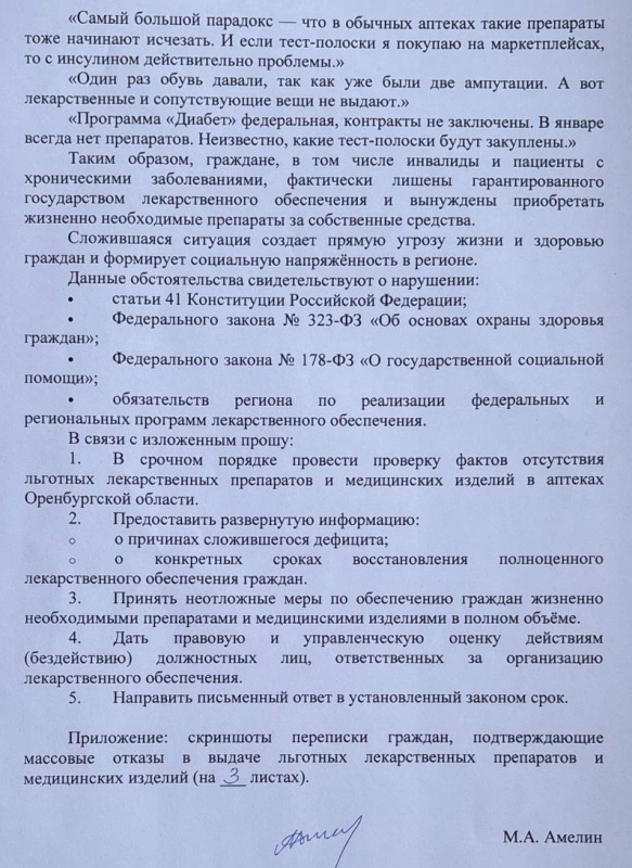 От главы минздрава Оренбургской области депутаты потребовали, чтобы была проведена проверка фактов отсутствия льготных препаратов и медицинских изделий в аптеках города. А также предоставить развернутую информацию о причинах дефицита. Кроме того, необходимо обеспечить всех больных жизненно важными препаратами в полном объеме и дать правовую оценку и управленческую оценку действиям должностных лиц, ответственных за организацию лекарственного обеспечения.