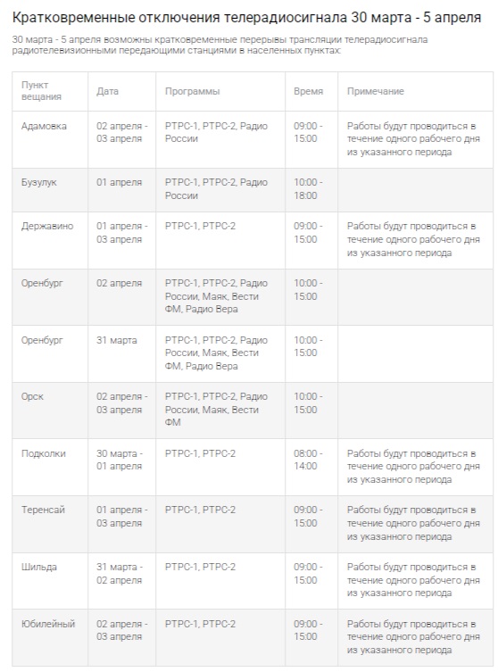 Перебои затронут около десяти населённых пунктов, включая Оренбург, Орск и Бузулук. В этот период на передающих станциях проведут плановые профилактические работы, для которых потребуется отключение оборудования.