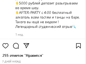 Известно, что отрывались по полной как минимум в двух ночных заведениях. Корреспонденты Orenday позвонили в оба. В первом нам сообщили, что заведение не работает из-за COVID-19. Их инстаграм-аккаунт закрыт. Во втором пояснили, что работают с четверга по воскресенье, до 6 утра. Можно за тысячу рублей забронировать столик. Кстати, в своем инстаграм-аккаунте они анонсировали День студента фразой: «Вы такого еще не видели». Получается, не обманули.