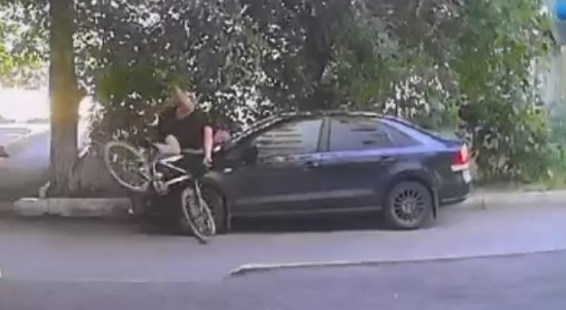В Оренбурге 26 июля в 17:43 минуты неизвестный велосипедист протаранил припаркованный "Фольксваген Поло" у дома №70 (13-й подъезд) по улице Чкалова. ДТП попало на камеры видеонаблюдения. Набравший приличную скорость мужчина в черной майке и черных шортах буквально "запрыгнул" на капот машины.
