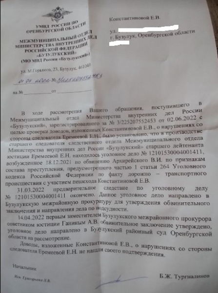 Но с самого того дня, когда произошло ДТП, в следственном отделе МО МВД России «Бузулукский» отнюдь не рьяно старались разобраться в произошедшем в тот злополучный октябрьский день на «зебре». Само уголовное дело по факту случившегося ДТП было возбуждено лишь 18 декабря 2021 года, пока немного оправившейся после аварии пострадавшей не была написана жалоба межрайонному прокурору. Потерпевшей же Елену Константинову признали лишь 11 января 2022 года. После чего сначала затягивалось получение страховых выплат, потому что старший следователь Елена Еремеева, расследующая данное дело, заявила, что в деле нет страхового полиса ОСАГО на автомобиль обвиняемого, хотя это было не так. Потом, со слов потерпевшей, началась фальсификация данных в протоколе осмотра места происшествия, что исказило картину ДТП, существенно увеличив скорость движения пешехода. А ведь именно на эти сведения опирались автоэксперты, делая заключения.
