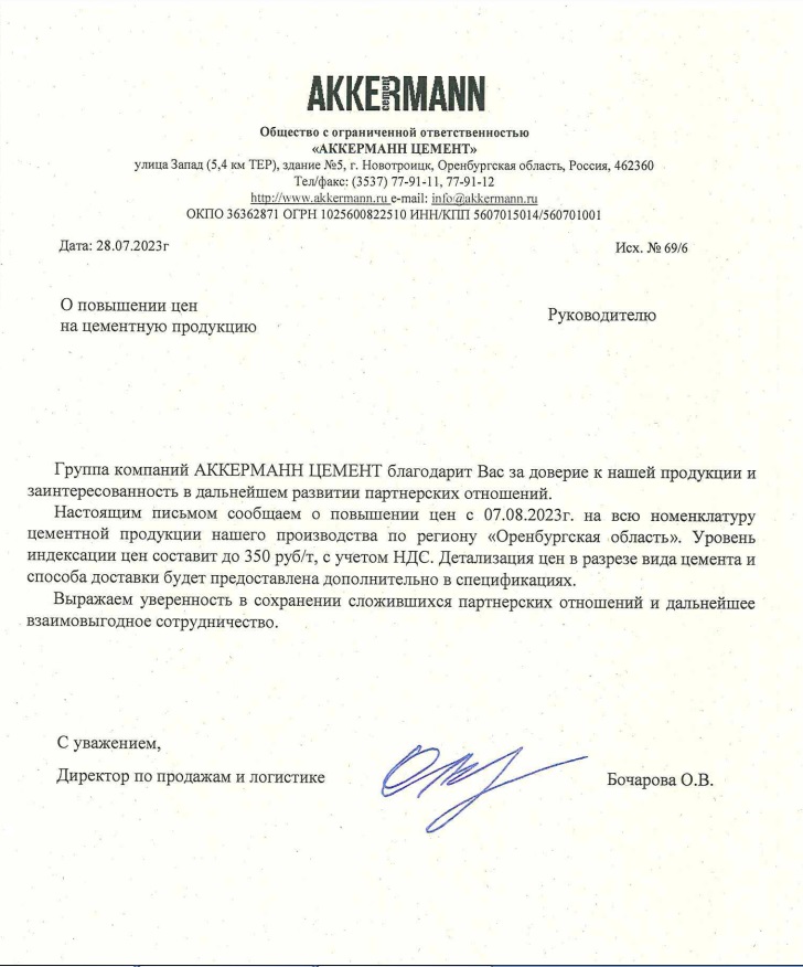 В день публикации orenday.ru о значительном удорожании цемента по сравнению с прошлым годом, завод Akkermann разослал партнерам оптимистичное письмо об очередном ценовом скачке «на всю номенклатуру цементной продукции нашего производства по региону «Оренбургская область».