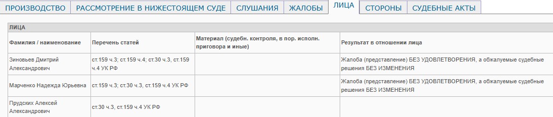 Кроме того, с Зиновьева и Марченко суд взыскал в счет возмещения имущественного ущерба в пользу хозяйки спа-салона 791 000 рублей. Отдельно с Зиновьева также взыскано 4,1 млн. рублей в качестве возмещения имущественного ущерба и компенсации морального вреда. С Прудских и Марченко в качестве компенсации морального вреда взыскано 100 000 и 200 000 рублей соответственно.