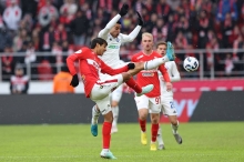 На 43-й минуте случился гол, но произошла его отмена - офсайд. И снова - "вне игры" оказался Маркиньос, из зоны левого инсайда поразивший ближний угол после передачи Эсекьеля Барко. К концу тайма "красно-белые" заметно начали активизироваться. Далее наш Татаев попал по ногам Угальде, вследствие чего тот упал на газон вблизи чужой штрафной площади. Однако штрафного удара у "Спартака" нет. За добавочную минуту произошел ещё один фол от "Спартака". На том и закончился первый тайм.