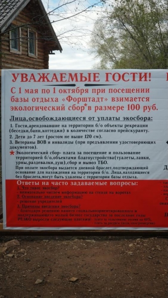 «Экологический сбор – это плата за посещение и пользование территорией базы отдыха, объектами благоустройства (туалеты, лавки, урны, раздевалки, душ), сбор и вывоз ТБО», - гласит баннер.