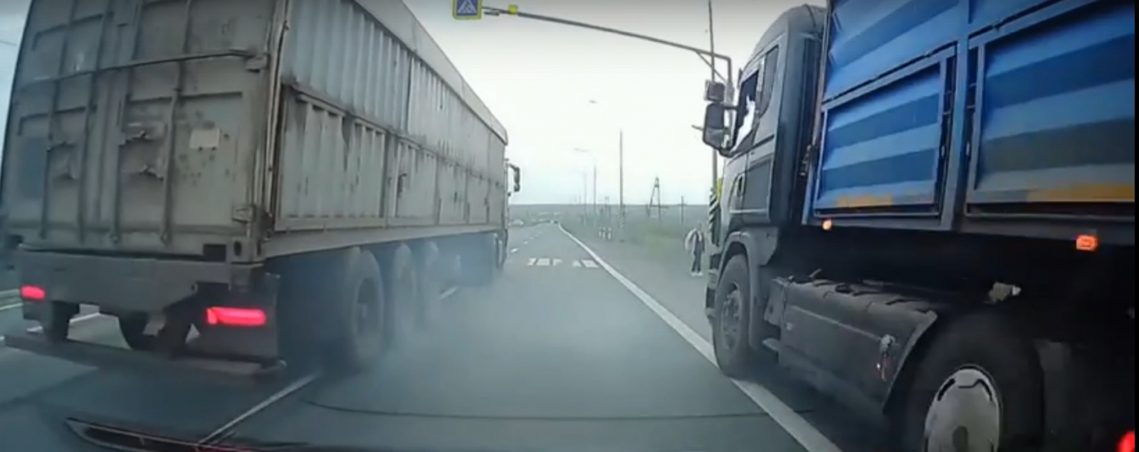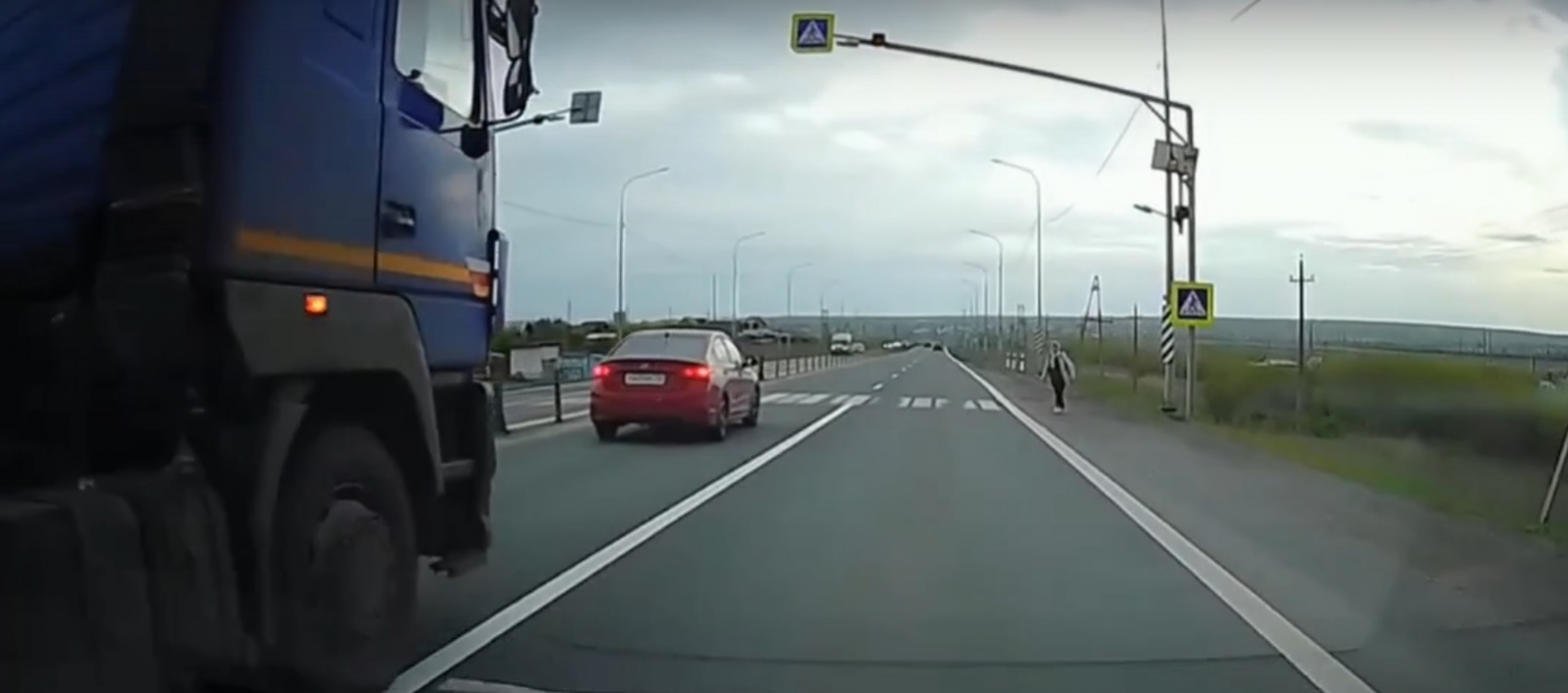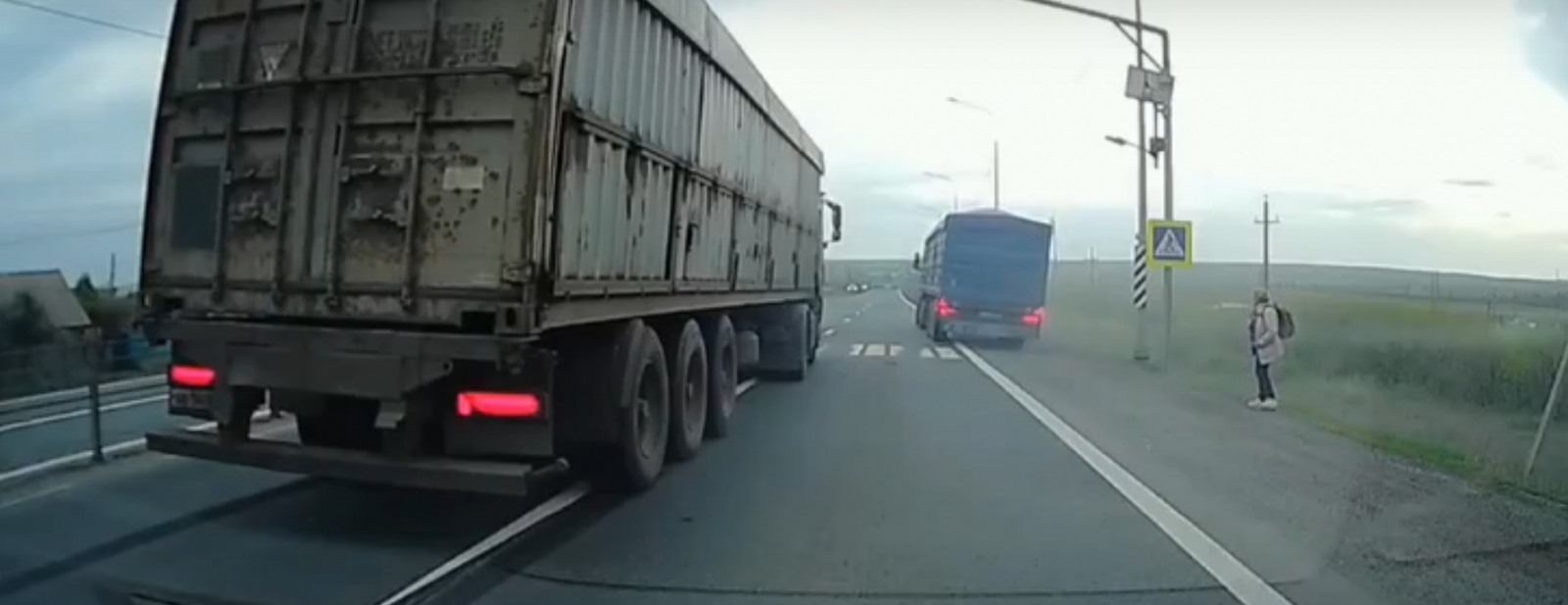На том злоключения не закончились. Через доли секунды по обочине промчался ещё один большегруз, едва не зацепив несчастную женщину.