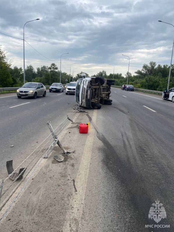 ГАЗель, ставшая также участницей аварии, осталась лежать на проезжей части прямо на разделительном ограждении из тросов, которое пробила Scania.