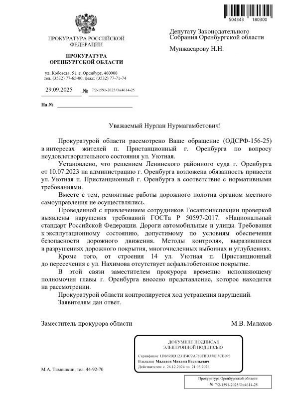 И вот стало известно о новом представлении: исполняющему полномочия мэра Оренбурга придется ответить за неисполнение решения суда аж от 2023 года. Речь идет о ремонте дороги по улице Уютной п. Пристанционный Оренбурга. Два года назад Ленинский райсуд обязал администрацию города привести данную дорогу в порядок: уже на тот момент она была в выбоинах, а местами дорожное полотно вовсе отсутствовало. Однако, про дорогу, как и про решение суда, видимо, забыли.