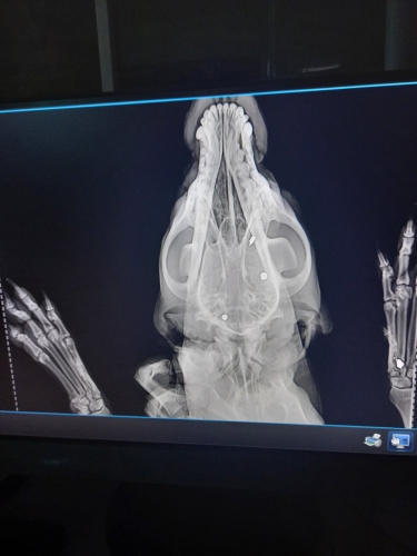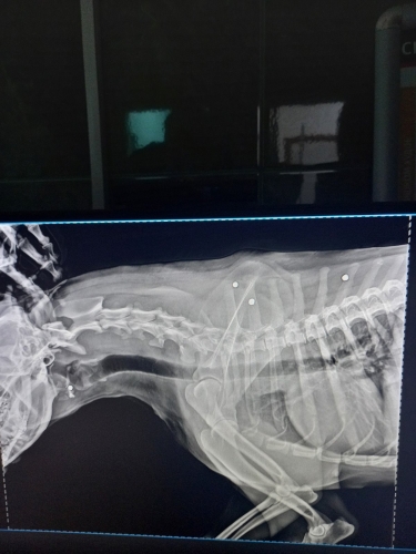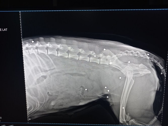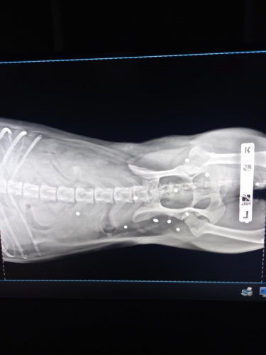 Оренбурженка связалась с волонтёрами приюта "Я - Живой". Удалось найти автомобиль, свозить животное в ветклинику. Как оказалось, её расстреляли из охотничьего ружья. В теле обнаружили 19 дробин. Не было практически ни одного живого места: повреждены голова, лапы, позвоночник, грудь, горло, живот, глаз. Врач отметил, что если бы стреляли с более близкого расстояния, то шансов выжить у бедной собаки не было бы...