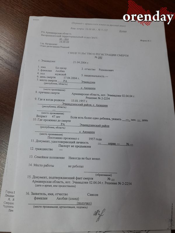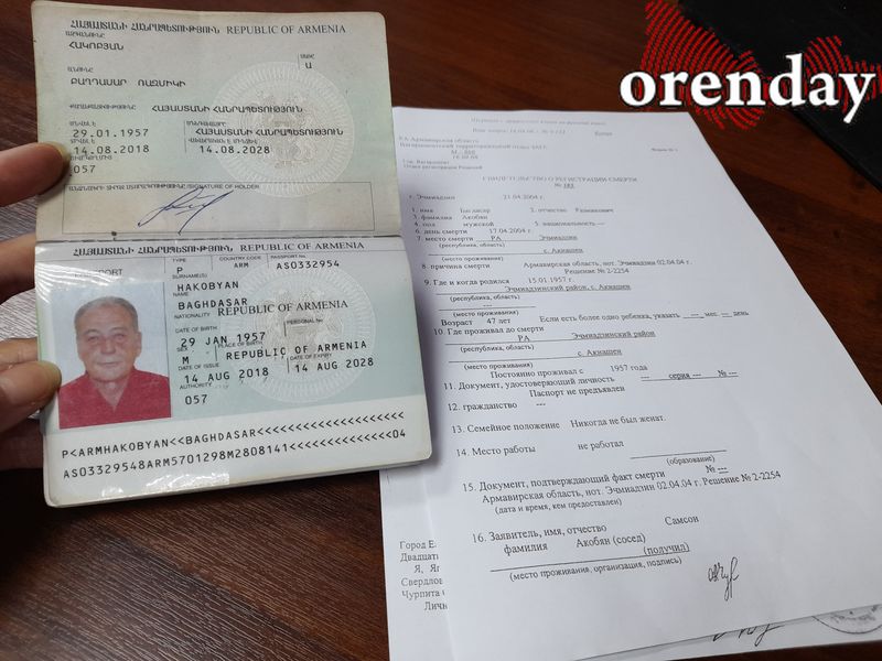 65-летний мужчина до того, как уехать в Россию, жил в селе Акнашен Армавирской области в родительском доме со своей мамой. Устраивая свою личную жизнь, переехал с женой в Россию, а в один из визитов домой испытал шок, узнав, что мамы не стало, а земельный участок и дом, собственником которых он является, чудесным образом оказались в посторонних руках. Причем свидетельство о регистрации смерти было выдано не кому-то из членов семьи Багдасара Акобяна, а его соседу, родственники которого в то время занимали высокие должности, сам же вопрос с переходом «бесхозной» недвижимости от одного собственника другому оказался чуть ли не минутным делом. Так дом перешел в собственность какого-то американца, которого сейчас и в живых-то нет.
