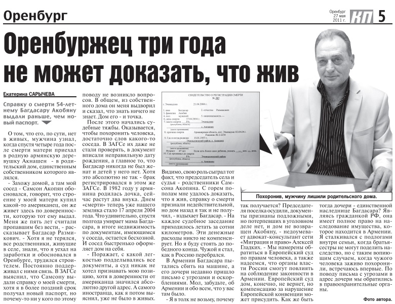 Долгие хождения по самым разным инстанциям и судебные процессы дали мизерный результат. Разве что звездой телеэкранов стал – о нём снимали сюжеты и программы, трубили сайты и газеты. Еще в 2011 году «Комсомока» рассказывала о том, что Багдасару с горем пополам удалось доказать, что он всё-таки живой, злополучную справку о его смерти признали недействительной.
