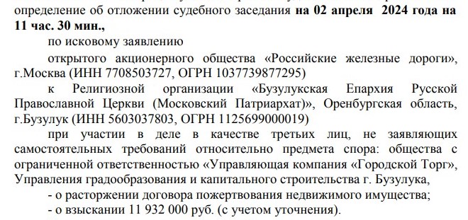ОАО «РЖД» внезапно обратилось в суд с требованием о расторжении договора пожертвования данного здания и взыскании с Бузулукской епархии 11 932 000 рублей неосновательного обогащения (сумма к взысканию рассчитана, исходя из рыночной стоимости пожертвованного ранее имущества). Бузулукский «Горторг», купивший в свое время у епархии объект на законных основаниях, к рассмотрению данного иска судом привлечен в качестве третьего лица. В таком же качестве проходит и управление градообразования и капитального строительства Бузулука.