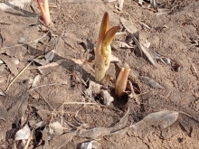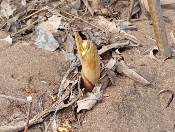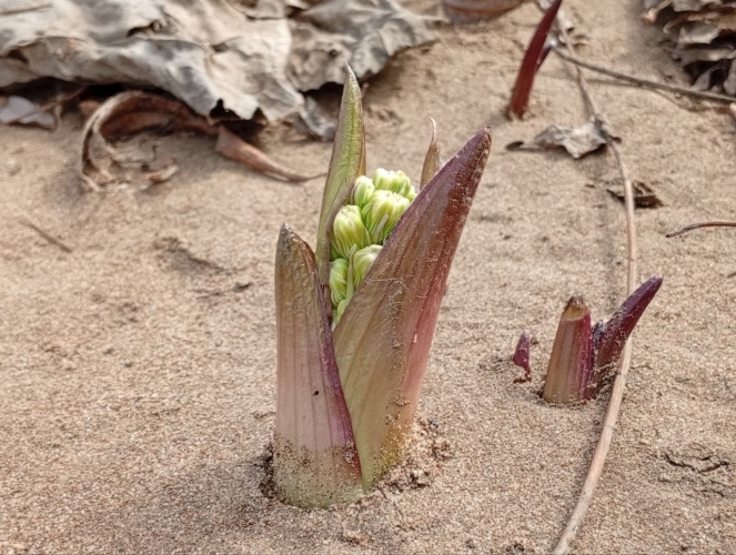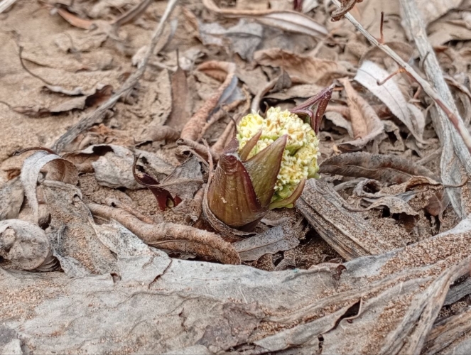 Это удивительное растение, уже к началу лета раскинет широкие листья и станет похоже чем-то на лопух, хотя виду ближе к мать-и-мачехе. Пока же небольшие бутоны выпускает цветоносы, из множества меленьки цветочков.