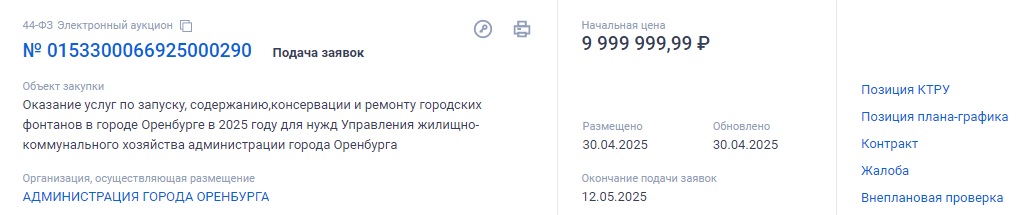 30 апреля на госзакупках только появился лот на оказание услуг по запуску, содержанию, консервации и ремонту городских фонтанов, и 12 мая будет последний день подачи заявок.