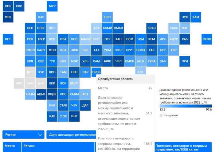 Только чуть более половины всех российских автомобильных дорог по итогам 2022 года отвечают нормативным требованиям, сообщают РИА Новости. Если не брать в расчет новые российские регионы, из 85 субъектов РФ в 41-м регионе хороших дорог чуть больше, чем в среднем по стране, в 44-х, в том числе в Оренбургской области, их меньше среднестатистических показателей.