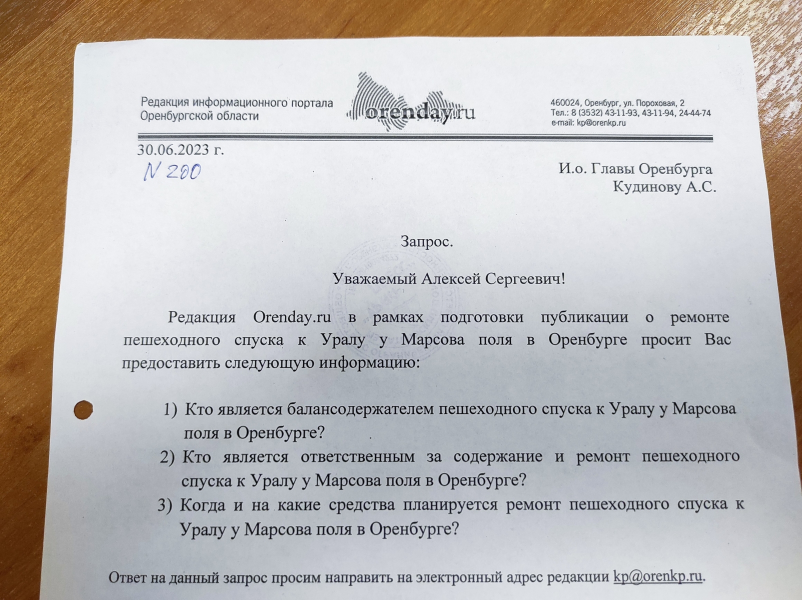 Нерасторопными сотрудники мэрии оказались и с запросом orenday.ru о судьбе спуска, который так и не нашли в канцелярии на Советской, 60, спустя месяц после отправки.